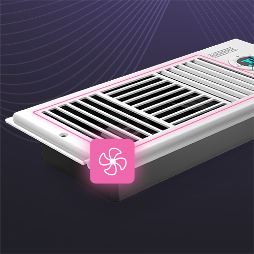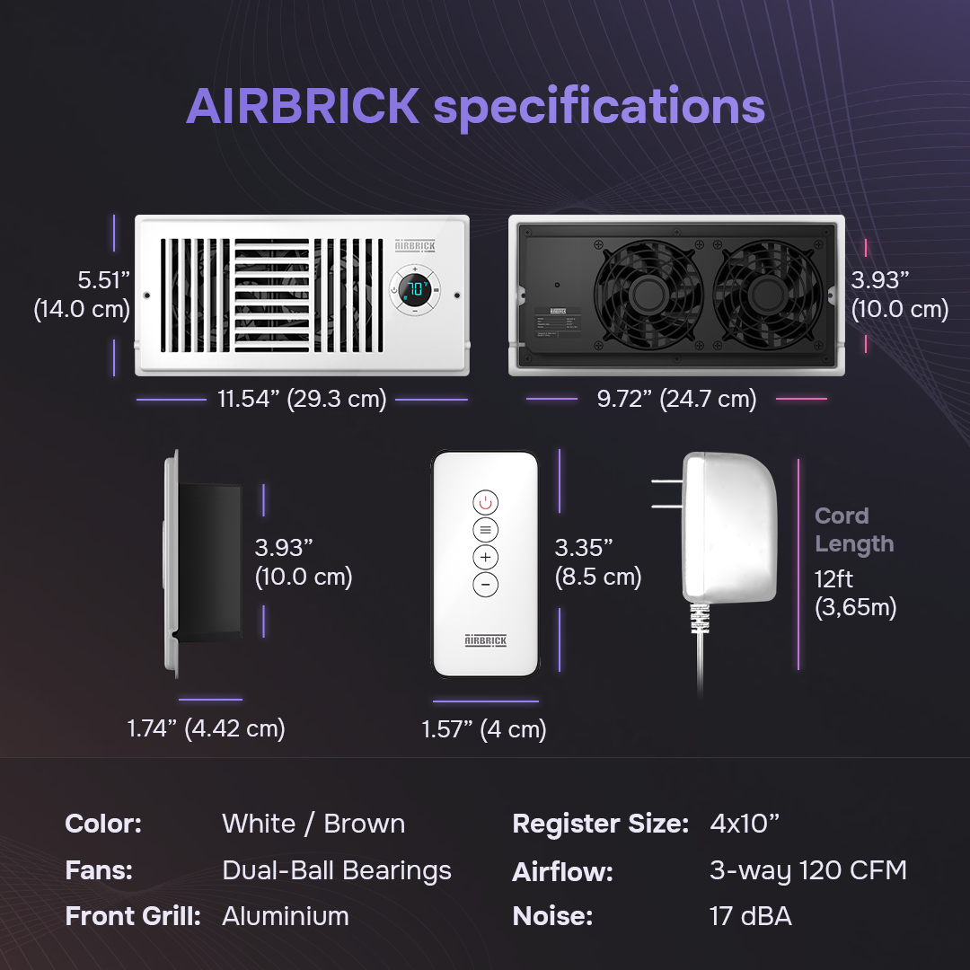 The Airbrick register booster fan showcases a three-way aluminum front grill that efficiently disperses the airflow. This design enhances airflow distribution, contributing to a more comfortable environment in your home. With its sleek and modern aesthetic, the Airbrick blends effortlessly into any room, adding both style and functionality to your home's HVAC system.